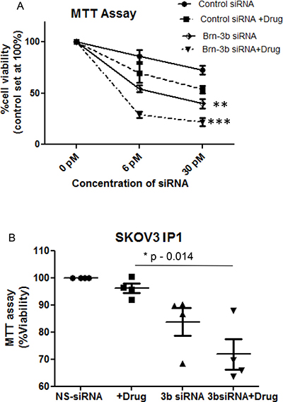siRNA silencing of Brn-3b expression reduces cell viability in SKOV3 or IP1 cells
