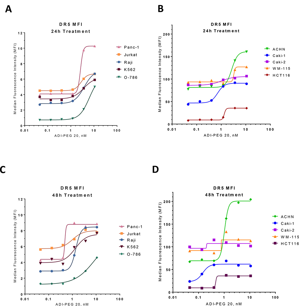 As shown on Figure 1, TRAIL receptor DR5 was upregulated on the surface of tested cell lines as soon as 24 h after treatment initiation (Figure 1A–1B) and remained upregulated after 48 h exposure to ADI-PEG 20 (Figure 1C–1D). Some of these cell lines (Panc-1, Jurkat, Raji, K562, O-786) had relatively low surface DR5 levels while others (ACHN, Caki-1, Caki-2, WM-115, HCT116) had relatively high surface DR5 which was further increased after ADI-PEG 20 treatment.
