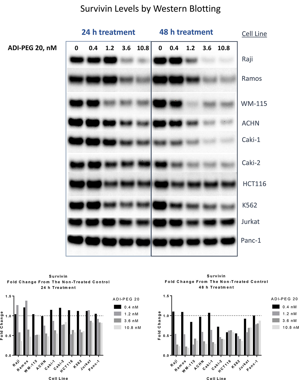 As shown in Table 1 and Supplementary Figure 1, ADI sensitizes cancer cells to TRAIL enabling them to overcome resistance to TRAIL induced apoptosis. Another group [34] showed that the combination of ADI-PEG 20 and rhTRAIL inhibited growth of four melanoma cell lines in vitro better than either single agent alone. They observed upregulation of DR4 and DR5 receptors and downregulation of survivin in two melanoma cell lines. In a panel of ten ADI-sensitive cancer cell lines following ADI treatment we have observed upregulation of TRAIL receptor DR5 (Figure 1) in all cell lines. Depending on the cell line, DR4 receptor was either not changed, upregulated or downregulated (in one cell line K562) (data not shown) and survivin was decreased, with the extent of decrease varying across the cell lines (Figure 2). Inhibitors of apoptosis XIAP, IAP-1 and IAP-2 were decreased in only some of the tested cell lines (Supplementary Figures 2–3).