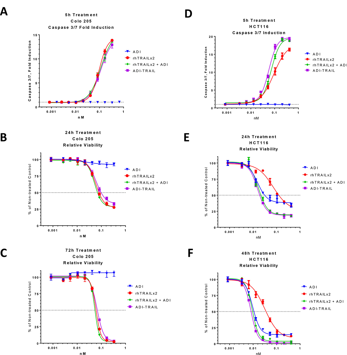 Sera from treated mice and recombinant purified ADI-TRAIL were diluted in cell culture media and added to plates with HCT116 or Colo 205 cells plated the day before. CellTiter-Glo was used to determine caspase 3/7 activation after 5 h incubation and CellTiter-Fluor was used to determine relative viability after 48 h incubation. Serially diluted ADI-TRAIL was used as a standard to interpolate the concentration of the fusion protein in serum samples.