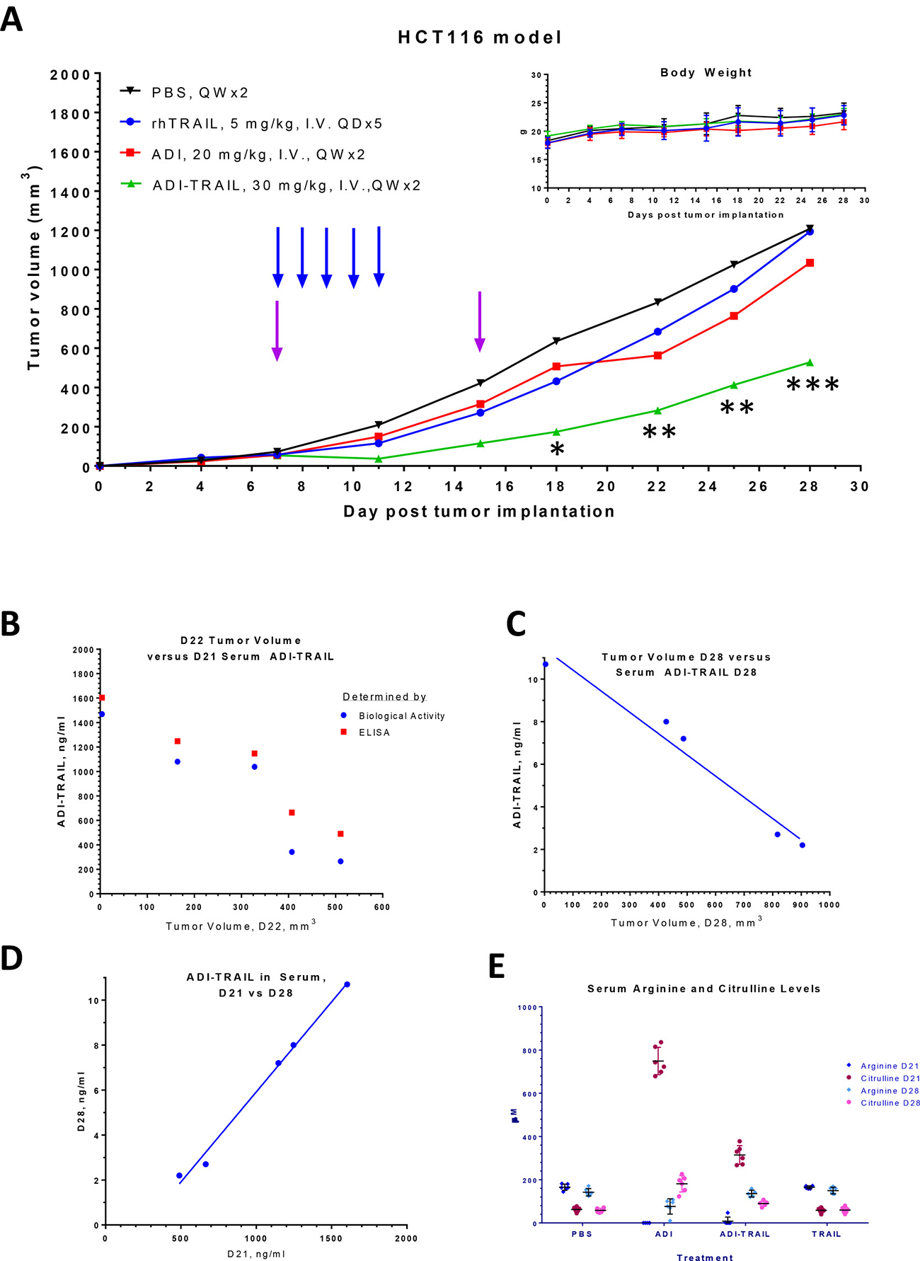 Figure 4: ADI-TRAIL is efficacious in HCT116 xenograft model. Mice were treated with rhTRAIL, ADI or ADI-TRAIL. In all groups mice maintained their body weight (A inset), reduced tumor growth was observed in ADI-TRAIL treatment group (A). Arrows indicate when the treatment was administered, blue for rhTRAIL and purple for the other three groups. The statistical significance of the tumor reduction in the fusion protein treated group as compared to the vehicle treated control group was assessed by the 2-way ANOVA, *p < 0.05, **p < 0.01, ***p < 0.001. Serum was taken on Days 21 and 28 post tumor implantation (Day 6 and 13 post last treatment). ADI-TRAIL concentration was measured using biological assay (B) and ELISA (B–D), and was found to be inversely correlated with the tumor volume (B–C). Arginine and citrulline levels were measured by LC/MS/MS (E).
