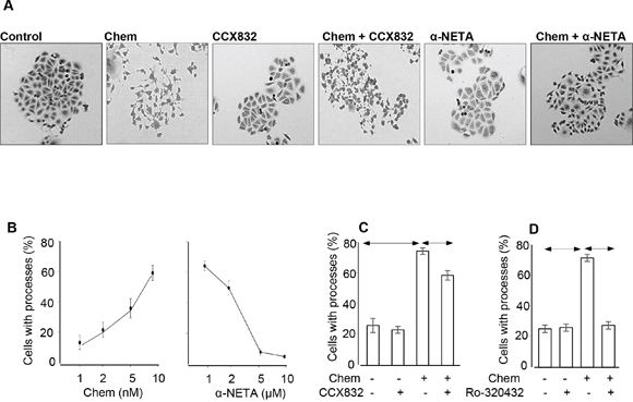 Figure 3: Chemerin induces a morphological transformation of AGS cells. (A) representative images of sub-confluent AGS cells showing that chemerin (Chem, 10 nM) induces cell scattering and extension of processes which is reduced by addition of CCX832 (1μM) and α-NETA (5μM); the latter have no effect alone. (B) Dose-response relationships for the action of chemerin alone in stimulating process extension by AGS cells (left) and of graded concentrations of α-NETA in inhibiting the effects of 10 nM chemerin (right). (C) Quantitative assessment of the proportion of cells exhibiting extension of processes after treatment with chemerin (10 nM), CCX832 (1μM) and Ro-320432 (1 μM); (n=3). Horizontal lines, p<0.05, ANOVA.