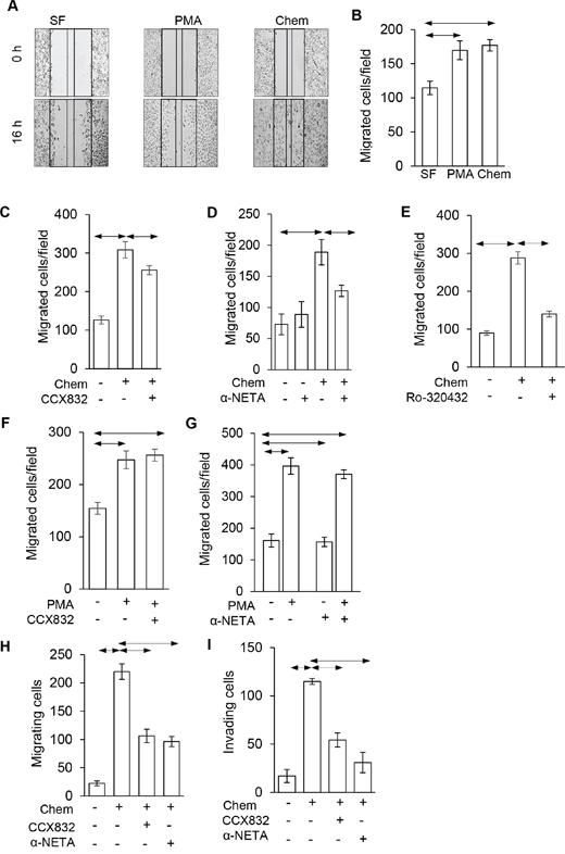 Figure 4: Chemerin stimulated AGS cell migration is inhibited by CCX832 and α-NETA. (A) Representative images showing scratch wound assays at 0 and 16 h and effect of chemerin (Chem, 10 nM) and phorbol 12-myristate 13-acetate (PMA, 100 nM) compared with control, serum-free (SF) medium. (B) Quantification of migrating cells in a defined area in scratch wound assays in response to chemerin and PMA. (C) The action of chemerin in scratch wound assays is inhibited by CCX832 (1 μ), (D) by α-NETA (5 μM) and (E), by Ro-320432 (1μM). (F), The action of PMA in scratch wound assays is not inhibited by CCX832, or (G) α-NETA. (H), In Boyden chamber chemotaxis migration assays, the effect of chemerin is inhibited by CCX823 and α-NETA; (I) similar data for Boyden chamber invasion assays. Horizontal lines, p<0.05 ANOVA.