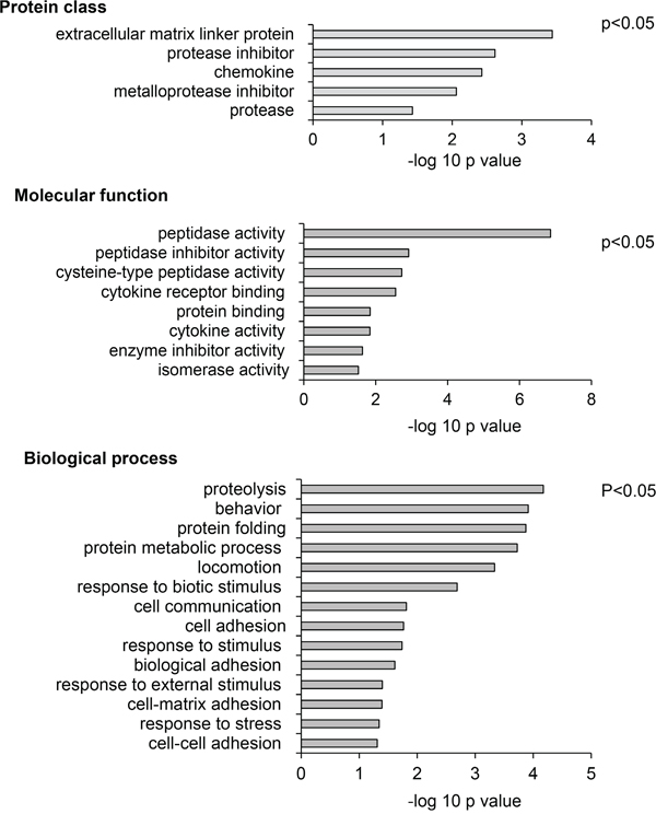Figure 6: Meta-analysis of SIDLS labeling of the AGS cell secretome identifies proteins involved in inhibition of proteolysis as targets of chemerin. Protein ANalysis THrough Evolutionary Relationships (PANTHER) analysis shows, top, enriched protein classes; middle, enriched molecular functions; bottom, enriched biological processes. In each case the –log of the probability is shown and data for p<0.05 included.