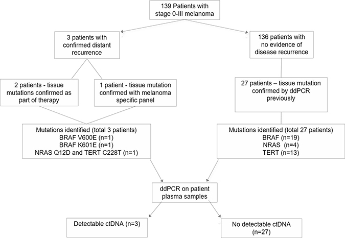 Patient enrolment and study overview are presented in Figure 1. We analyzed a group of patients that were prospectively accrued into the “Blood Based Biomarkers: Prognostic Tools for Melanoma Recurrence” project between July 2013 and February 2017. The study was approved by the Human Research Ethics Committee of Edith Cowan University under reference numbers 11543 and 13313 and Sir Charles Gairdner Hospital (no.2013-246). A cohort of 139 melanoma patients (stage 0–III), diagnosed and resected in the previous 10 years were eligible for enrolment. A blood sample was collected at enrolment and then again between 3–25 months thereafter. Overall, three cases experienced distant disease recurrence during the sample collection period. The BRAF mutation status of these three tumors was determined previously [38] and by Next Generation Sequencing (NGS) using a custom targeted sequencing panel for a third case which was found to be BRAF wild-type. A subset of patients (n = 27) with no clinical evidence of disease recurrence at last follow-up was selected for ctDNA assessment. The main criteria for their selection was based on the availability of primary tumor mutational data determined as part of a previous study [39] in which they were found to be positive for at least one of the common melanoma mutations (BRAF, NRAS, TERT).