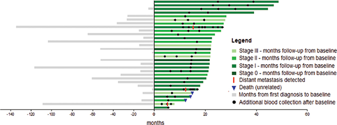 Figure 2: Swimmers plot in months from diagnosis of first primary melanoma to last follow-up. A total of 30 patients were assessed in the study. Bar colors indicate the melanoma stage at enrolment. All patients had a blood sample drawn at enrolment (zero months) and at the time points indicated (black dots). Three patients experienced recurrence during study follow up (red line) and another three cases died from reasons unrelated to melanoma (blue triangle).