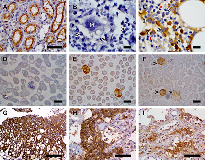 Figure 4: Representative examples of FR expression detected on canine kidney (A), canine bone marrow sections (B, C), canine peripheral blood smears (D, E, F), and canine iUC (G, H, I). FR expression was detected by immunohistochemistry in panels (A–C) and (G–H), and by immunocytochemistry in panels (D–F). (A) Canine kidney used as a positive control. Immunoreactivity is detected on the apical surface of the proximal renal tubular epithelium. Image taken at 40× magnification. Scale bar = 50 μm. (B) Canine bone marrow section used as negative control. Note the absence of immunoreactivity in granulocytes (black arrowheads) and megakaryocytes (white “M”). (C) Paired bone marrow sample showing FR expression by early myeloid precursor cells (white arrowheads) and granulocytes (black arrowhead). Erythroid precursors (red asterisk) do not display immunoreactivity. (D) Canine peripheral blood smear negative control. (E) Paired specimen showing marked cytoplasmic and membranous immunoreactivity in granulocytes. (F) Absence of FR immunoreactivity on lymphocytes (black asterisk) contrary to positive immunoreactivity on granulocytes (black arrowheads). Images B to F were taken at 100× magnification. Scale bars = 10 μm. (G) Canine iUC, urinary bladder. Strong labeling of neoplastic cells for FR is observed. Scale bar = 200 μm. (H and I) Pulmonary metastases of canine iUC. Note the uneven labeling for FR. Scale bar = 75 μm. All images were collected with an Eclipse E400 microscope equipped with a Plan Fluor 40×/0.75 and a Nikon Plan Fluor 100×/1.30 oil objectives. Images were acquired with a DS-Fi2 camera controlled with the Digital Sight DS-L3 controller and the NIS-Elements F (4.60.00 version) software. Figures were prepared using the GIMP (version 2.8.22 version) image processing software.