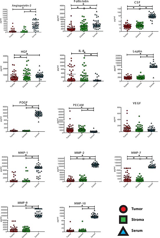 Figure 1: Expression analyis of angiopoietin-2, follistatin, granulocyte colony-stimulating-factor, (G-CSF), hepatocyte growth factor (HGF), interleukin-8 (IL-8, CXCL8), leptin, platelet-dereived growth factor beta (PDGF-BB), platelet endothelial cell adhesion molecule-1 (PECAM-1, sCD31), vascular endothelial growth factor (VEGF). Matrix metalloproteinase (MMP)-1, -2, -7, -9, and -10 in tumor epithelial cells, tumor-associated stroma, and corresponding serum samples. The concentratons are given as pg/ml for each parameter. (*) marks a signficant difference (p < 0.05) between the expression of angiogenic cytokines or MMPs among the three different compartments.