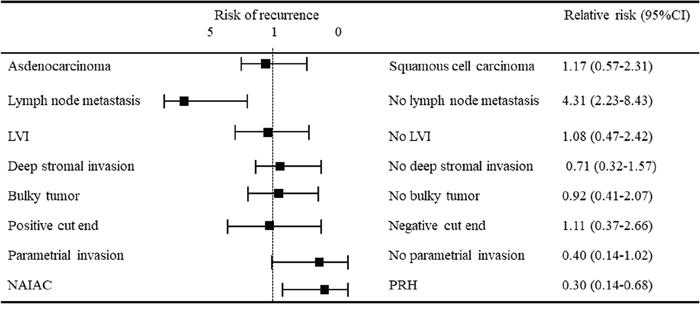Figure 4: The results of multivariant analysis for risk of recurrence. Lymph node metastasis and NAIAC were independent factors for recurrence. Other factors including histological type, lymphovascular involvement, deep stromal invasion (more than half myometrial invasion), bulky tumor (more than 4 cm), positive cut end, and parametrial invasion were not independent risk factors on multi variant analysis.