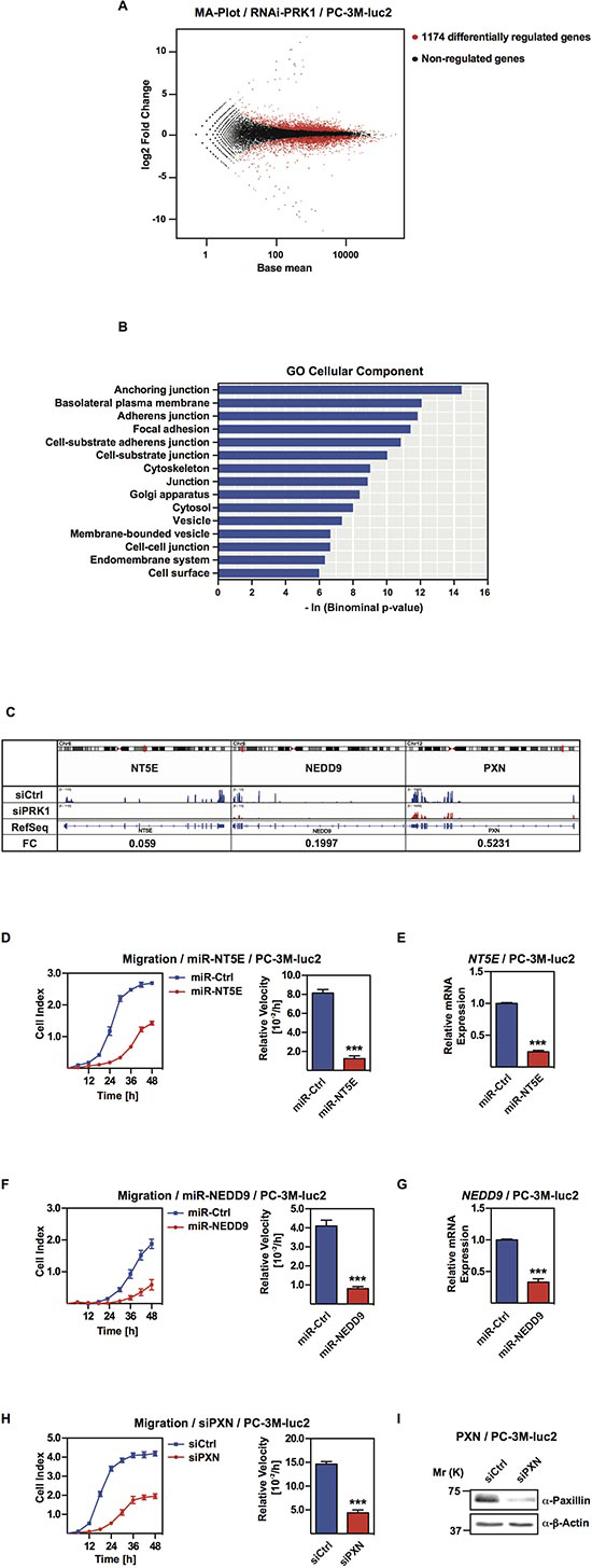 Figure 2: PRK1 regulates transcription of genes determining migration and invasion. (A) MA-Plot representing the differentially regulated genes (red dots) in PC-3M-luc2 cells upon knock down of PRK1. (B) DAVID analysis for GO “cellular component” for differentially regulated genes with a p-value < 10-3. (C) Read coverage displaying the downregulation of NT5E, NEDD9, and PXN upon PRK1 knockdown. FC: Fold Change. (D, F) Migration assays of PC-3M-luc2 cells stable transfected with miRNA against NT5E (miR-NT5E), NEDD9 (miR-NEDD9), or unrelated control miRNA (miR-Ctrl). (E, G) Efficiency control of knockdown. mRNA levels of NT5E or NEDD9 were analyzed by qRT-PCR. (H) Migration assay of PC-3M-luc2 cells treated with siRNA against PXN (siPXN) or unrelated siRNA (siCtrl). (I) Efficiency control of knockdown. Protein expression of PXN was analyzed by Western blots. (D, F, H) Cell indices and relative velocities are shown. n ≥ 3. Error bars represent ± SD or + SD. *** p ≤ 0.001.