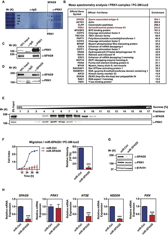 Figure 3: PRK1 associates with SPAG9 in PC-3M-luc2 cells. (A) Coomassie-staining of SDS-page after immunoprecipitation with anti-PRK1-antibody. (B) PRK1 interacting proteins identified by mass spectrometry. (C, D) Western blots showing coimmunoprecipitation of endogenous PRK1 with SPAG9. (E) PRK1 in complex with SPAG9 verified by sucrose gradient centrifugation. Western blot were decorated with the indicated antibodies. (F) Migration assays of PC-3M-luc2 cells stable expressing miRNA against SPAG9 (miR-SPAG9) or control (miR-Ctrl). (G) Levels of SPAG9 and PRK1 were analyzed by Western blot. (H) Efficiency control of SPAG knockdown and expression of “signature genes”. mRNA levels of SPAG9, PRK1, NT5E, NEDD9, and PXN were analyzed by qRT-PCR. (F) Cell index and relative velocities are shown. n ≥ 3. Error bars represent ± SD or + SD. *** p ≤ 0.001.