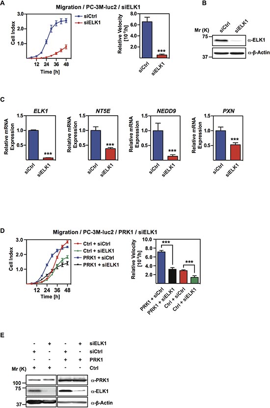 Figure 5: ELK1 regulates migration and occupies PRK1-regulated genes. (A) Migration assay of PC-3M-luc2 cells treated either with siRNA against ELK1 (siELK1) or unrelated control siRNA (siCtrl). (B) Verification of ELK1 knockdown by Western blot analysis. (C) mRNA levels of ELK1, NT5E, NEDD9, and PXN after knockdown of ELK1 (siELK1) or control siRNA (siCtrl) in PC-3M-luc2 analyzed by qRT-PCR. (D) Migration assay of PC-3M-luc2 overexpressing PRK1 or control treated with either siRNA against ElK1 (siELK1) or unrelated control siRNA (siCtrl). (E) PRK1 overexpression and ELK1 knockdown was verified by Western blot analysis with the indicated antibodies. β-Actin was used as loading control. (A, D) Cell indices and relative velocities are shown. n ≥ 3. Error bars represent ± SD or + SD. ** p ≤ 0.01, *** p ≤ 0.001.