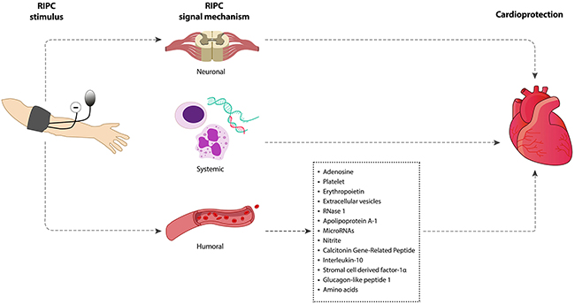 The current therapeutic strategy to I/R injury is ischemic conditioning, which is an endogenous approach to protect the heart against acute I/R injury. Murry et al. used a canine model to provide the first demonstration that brief episodes of non-lethal I/R to the heart prior to sustained ischemia can dramatically reduce MI size, an endogenous cardioprotective phenomenon termed ischemic preconditioning (IPC) [4]. IPC has been well studied and found to reduce I/R associated damage to other organs including the lung [5], kidney [6], liver [7], skeletal muscle [8], intestine [9], brain [10] and improve post-operative recovery from cardiac surgeries [11]. The potential clinical application of IPC is restricted to elective cardiac surgeries, where the timing of ischemic insult is well controlled. However, patients with acute myocardial infarction (AMI) presented with blocked coronary arteries, making it impossible to precondition the heart. Ischemic postconditioning (IPost), where a non-lethal I/R is performed to the heart by interrupting the PCI-induced reperfusion, delivers a similar outcome to IPC making it a better strategy to treat patients with AMI. Both IPC and IPost require interventional approaches, which limit application in clinical settings. In contrast to directly preconditioning the target organ, Przyklenk and Whittaker in 1993 made the intriguing discovery that preconditioning the heart does not limit its efficacy to the perfused area of the coronary artery, but was extended to remote myocardial tissue [12]. Similarly, Liauw et al. showed that skeletal muscle can be protected against I/R by preconditioning the contralateral skeletal muscle [13]. This discovery facilitated the extension of preconditioning techniques to protect other organs beyond the heart. This approach of remotely protecting a target organ through ischemic preconditioning is known as remote ischemic preconditioning (RIPC). A major advance in myocardial RIPC came with the use of skeletal muscle as the origin of RIPC stimulus and brief I/R produced with a tourniquet applied to one of the hind limbs of pig [14]. This lead to a blood pressure measuring cuff around the arm to achieve the RIPC stimulus making it possible to accommodate most of the clinical settings of acute I/R injury. In a non-invasive approach, RIPC has the capacity to protect the organ or tissue whether applied prior to I/R (RIPC), after ischemia but prior to reperfusion (PerC) [15] or during reperfusion (remote ischemic postconditioning, RIPost) [16]. Pryds and colleagues demonstrated the long term effect of RIPC on heart failure patients and reported that though RIPC does not improve left ventricular ejection fraction (LVEF) but reduces blood pressure and NT-proBNP in patients with compensated chronic ischemic heart failure [17] and may reduce the risk of thrombosis by stimulating fibrinolysis [18]. Table 1 summarizes the key clinical trials on the effect of RIPC prior to coronary artery bypass graft (CABG) and PCI. Previous review papers by Hausenloy and Yellon in 2008 [19] and Costa et al. in 2013 [20] discussed the cardioprotective pathways induced by RIPC. The present review focuses on the circulating mediators of RIPC that underpin signal transduction mechanisms from the remote organ to the target organ.