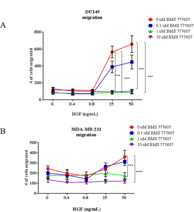 Figure 5: Transwell migration assays of paracrine-activated tumor cells. (A) DU145 and (B) MDA-MB-231 migration assays. Cells were treated with BMS-777607 and/or HGF and allowed to migrate for 24 hours through an 8 μm pore membrane. Results are a combination of three independent experiments. Multiple comparisons ANOVA was performed using GraphPad Prism 6.0, with p < 0.05 considered significant. Mean with SEM bars are shown.