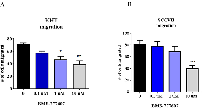 Figure 6: Transwell migration assays of autocrine-activated tumor cell lines. (A) KHT and (B) SCCVII migration assays. Cells were treated with BMS-777607 and allowed to migrate for 24 hours through an 8 μm pore membrane. Results are a combination of three independent experiments. One way ANOVA was performed using GraphPad Prism 6.0, with p < 0.05 considered significant. Mean with SEM bars are shown.