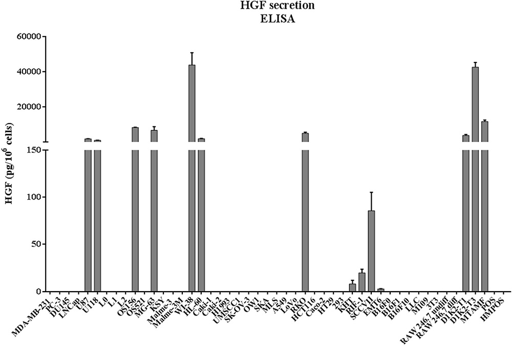 Forty-nine cell lines were tested for HGF secretion. These included human, murine, and canine tumor cell lines, as well as human and murine stromal cells (Figure 2), with HGF normalized as pg/106 cells. The following 14 cell lines were found to secrete HGF: U87, U118, OS156, MG-63, WI-38, HL-60, RKO, KHT, RIF-1, SCCVII, EMT6, D1K2-T1, D1K2-T3, and MTAMF.