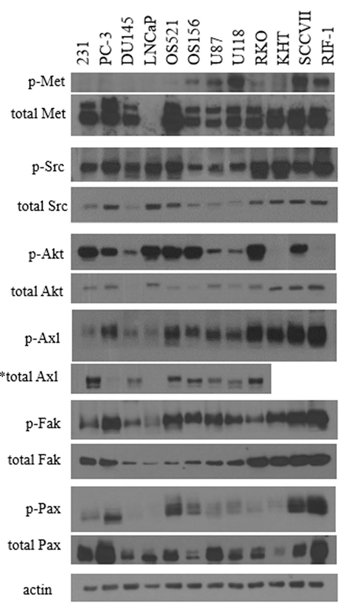 Figure 10: Comparison of phosphorylated and total protein between tumor cell lines. Cell lysates were probed for phospho-EGFR (Y1068), total EGFR, phospho-Src (Y418), total Src, phospho-Akt (T308), total Akt, phospho-FAK (Y861), total FAK, phospho-Axl (Y776), total Axl, phospho-Pax (Y118), total Pax, phospho-Met (Y1234/1235), total Met, and actin. *Total Axl antibody is specific for human.
