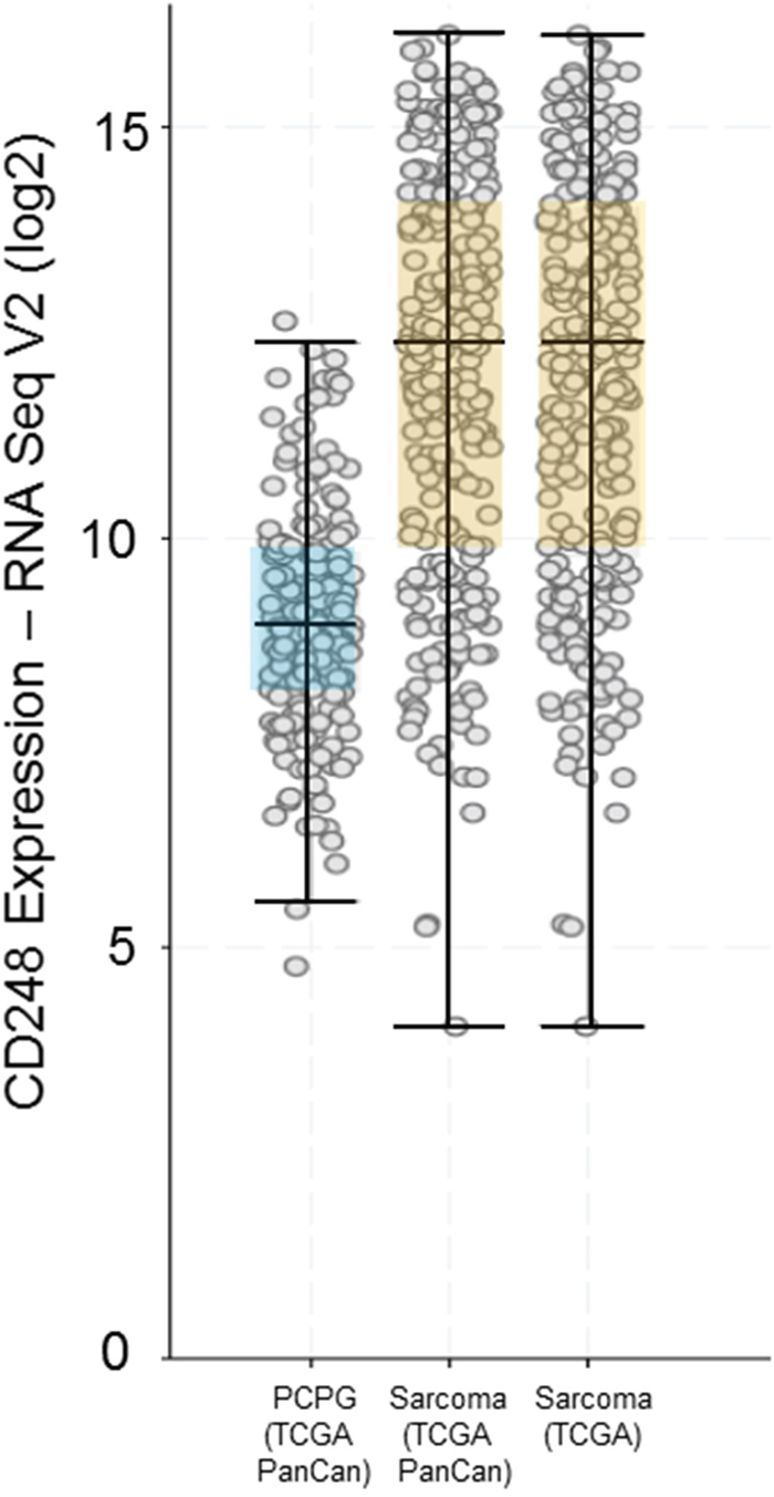 Figure 3: CD248 expression by RNA Seq V2 (log2) from the Cancer Genome Atlas (TCGA) showing expression of CD248 in pheochromocytoma and paraganglioma (PCPG) and Sarcoma.