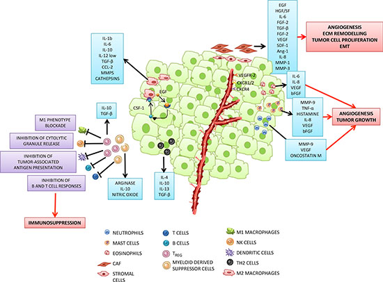 Figure 1: Tumor microenvironment: a complex network of intercellular interactions between tumor and inflammatory cells. Cancer cells in primary tumors are surrounded by a complex microenvironment composed of tumor stroma, blood vessels and infiltrating inflammatory cells. Different types of cells are found in the stroma, including fibroblasts, vascular smooth muscle, epithelial and immune cells. The latter cells comprise effectors of both adaptive immunity, such as T and B lymphocytes, and innate immunity, i.e. macrophages, dendritic cells (DCs), neutrophils, mast cells, eosinophils and natural killer (NK) cells. Most of the stromal cells participate in the promotion of the tumor growth. Cancer associated fibroblasts (CAFs) and M2 like polarized macrophages (tumor associated macrophages: TAMs), which can be induced by tumor-derived factors (for example, TGF-β, FGF or PDGF, among others), support tumor growth, angiogenesis, extracellular matrix remodelling and epithelial mesenchymal transition (EMT), by secreting a plethora of pro-tumorigenic proteases, cytokines and growth factors. For example, EGF, secreted by TAMs, participates in a paracrine signaling loop through tumor-secreted colony stimulating factor (CSF-1). VEGF, CXCL12, IL-8 secreted by CAFs or TAMs interact with their respective receptors expressed by endothelial cells and promote tumor angiogenesis. As tumors grow, immune-suppressor cells, including myeloid derived suppressor cells (MDSC) and T regulatory (TREG) cells infiltrate the tumor to disrupt immune surveillance through multiple mechanisms, including inhibition of tumor-associated antigen presentation by DCs, T and B cell responses, NK cell cytotoxicity and blockade of M1 macrophage phenotype. Moreover, tumor progression is associated with the increase of TH2 cells secreting immunosuppressive molecules such as IL-4, IL-10 and TGF–β. Mast cells, neutrophils and eosinophils are also recruited to the tumor site where they secrete proliferative and pro-angiogenic factors.