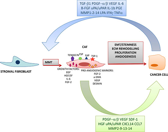 Figure 2: Interaction between CAFs and cancer cells. Cancer-derived factors induce a Mesenchymal Mesenchymal Transition (MMT) through which resident normal fibroblast are activated and acquire the expression of various markers such as tenascin, fibroblast specific protein (FSP), fibroblast activation protein (FAP), thrombospondin-1 (TSP-1) and pro-angiogenic molecules. In turn, CAFs secrete various growth factors which sustain tumor progression by promoting Epithelial Mesenchymal Transition (EMT), stemness, extracellular matrix remodelling, proliferation and angiogenesis.