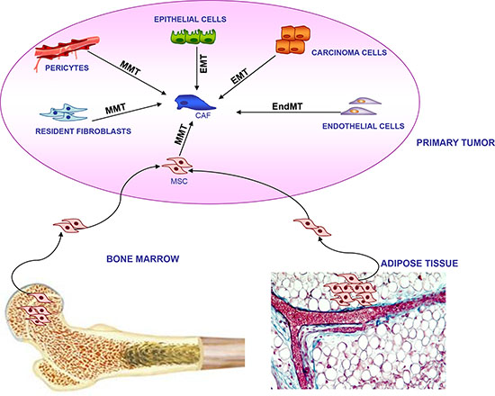 Figure 3: Multiple origin of CAFs within tumor microenvironment. CAFs can derive from local cells residing in primary tumor, including epithelial cells and carcinoma cells through Epithelial Mesenchymal Transition (EMT); resident fibroblasts and pericytes through Mesenchymal Mesenchymal Transition (MMT); endothelial cells through Endothelial Mesenchymal Transition (endMT). Alternatively, CAFs may originate from long distance bone marrow and adipose tissue mesenchymal stromal cells (MSCs) through an MMT transition.