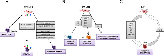 In conclusion, BM-MSCs/CAFs promote growth, survival and migration of cells derived from haematological malignancies by different pathways as depicted in Figure 4.