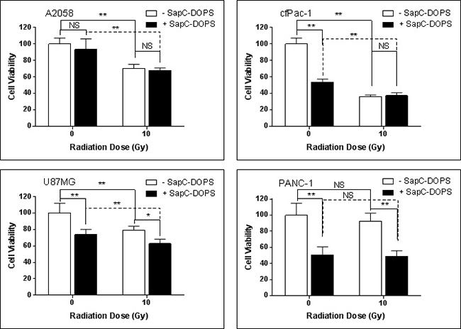 Figure 4: Single irradiation has modest or no effect on SapC-DOPS-induced cell death. Cells were irradiated at 10 Gy and 24 hours SapC-DOPS was added. Cell death was analyzed 72 hr. later with the MTT assay. The SapC-DOPS concentration was 25 μM for A2058, cfPac-1 and PANC-1 but 40 μM for U87MG. Shown is the % of live cells compared to the control (no irradiation, no SapC-DOPS) for each cell line. *p < 0.05, **p < 0.01, NS = not significantly different from control.