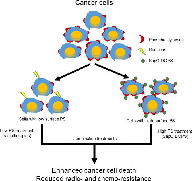 Schema 1: Phosphatidylserine-selected therapies of SapC-DOPS nanovesicles and radiation to enhance cancer cell death.