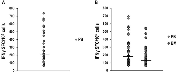 Figure 1: IFNγ-ELISPOT assay to investigate NPM1-mutated-specific T-cell responses. Detection of NPM1-mutated-specific T cells producing IFNγ in peripheral blood (PB) and bone marrow (BM) samples, collected at different time-points from NPM1-mutated AML patients, after brief ex vivo stimulation (20 hours) with NPM1-mutated peptides. The ELISPOT assay, carried out after stimulation with a mixture containing all 18 NPM1-mutated (9–18 mers) peptides, documented NPM1-mutated-specific T cells in 34/52 (65.4%) PB samples (median 214 SFC/106 cells, range 63–736) (Panel A). NPM1-mutated-specific T cells were found by ELISPOT assay after stimulation with the combination of 13.9 and 14.9 peptides (Panel B), in 43/85 (50.6%) PB samples (median 194 SFC/106 cells, range 62–696) and in 34/80 (42.5%) BM samples (median 133 SFC/106 cells, range 62–546). Median absolute lymphocyte count observed in the analyzed BM samples was 1.9 × 109/L (range 0.2–9.5). Black bars show median values. (P value > 0.05, Mann–Whitney U Test).