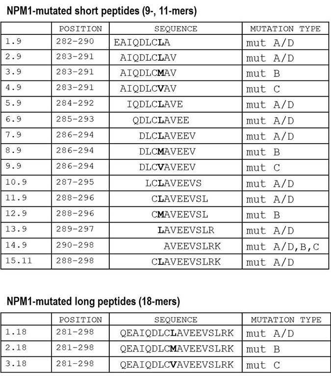 Figure 2: List of NPM1-mutated-derived peptides. Position and sequences of 18 peptides deriving from the complete C-terminal of the NPM1-mutated protein, representative of the most common NPM1 gene mutations, namely A/D, B and C. We designed 15 short (9-, 11-mers) and 3 long (18-mers) peptides. The different aminoacidic residue specific for each mutation type is marked in bold.