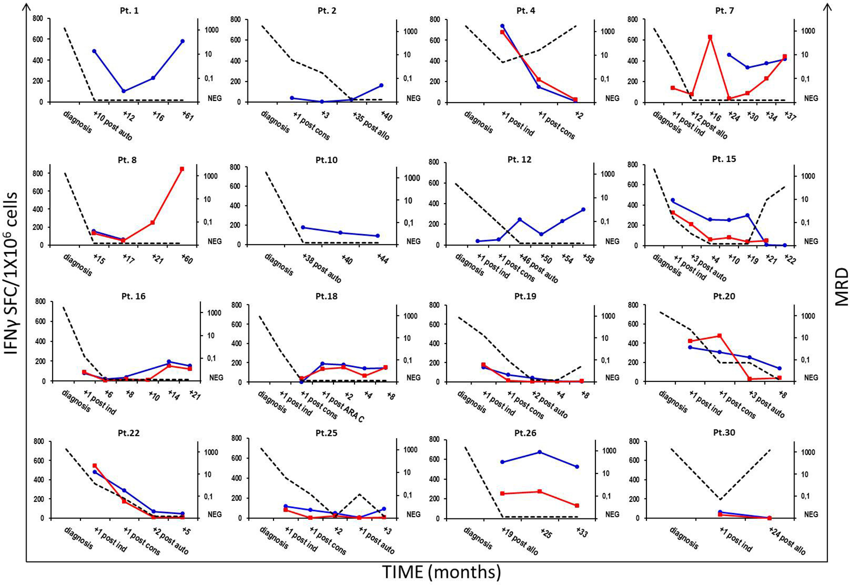 Figure 4: Correlation between NPM1-mutated-specific T-cell responses and AML course. Immunological monitoring of NPM1-mutated-specific immune responses in either PB or BM samples from 16 patients with NPM1-mutated AML and correlation with the molecular disease course. Frequencies of IFNγ-secreting NPM1-mutated-specific T cells were assessed at different time-points, showing an inverse correlation between NPM1-mutated-reactive T cells and minimal residual disease (MRD) kinetics. Longitudinal data tracking MRD kinetics (right, y-axis; black dotted line) and IFNγ-ELISPOT responses observed in PB and BM samples (left, y-axis, blue and red continuous lines, respectively) are summarized in a single time-course graph for each patient.