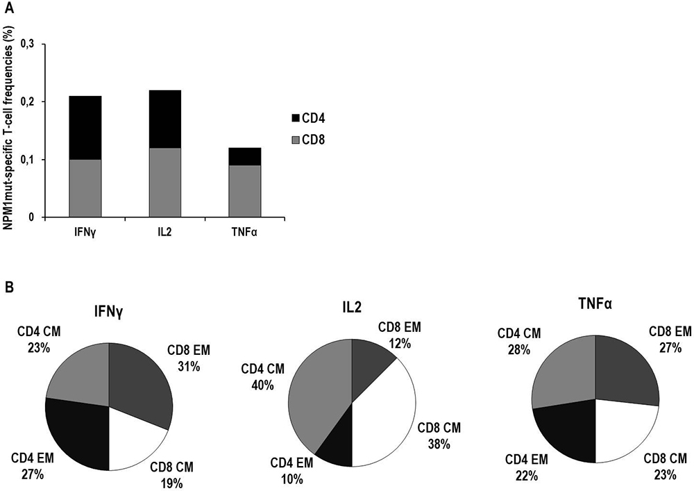 Figure 5: Characterization of cytokine production and memory T-cell profiles of NPM1-mutated specific T cells by cytokine secretion assay (CSA). Frequencies of NPM1-mutated-specific T cells secreting IFNγ, IL2 or TNFα in BM and PB samples, collected from a total of 18 patients, are expressed as median percentages of CD8+ T cells (gray columns) or CD4+ T cells (black columns) (Panel A). In detail, median frequencies (percentage, range) were as follows: IFNγ–producing CD8+ T cells 0.1% (0.02–0.84), IFNγ–producing CD4+ T cells 0.11% (0.03–0.51), IL2–producing CD8+ T cells 0.12% (0.01–0.62), IL2–producing CD4+ T cells 0.1% (0.01–0.52), TNFα–producing CD8+ T cells 0.09% (0.01–0.91), TNFα–producing CD4+ T cells 0.03% (0.01–0.69). In panel B, the memory T-cell profiles of NPM1-mutated-specific T cells, collectively found in PB and BM samples, are shown. For each cytokine-secreting NPM1-mutated-specific T-cell subset, black portions and light gray portions represent the median percentages of CD4+ effector memory (EM) T cells and CD4+ central memory (CM) T cells, respectively, while dark gray portions and white portions represent the median percentages of CD8+ EM T cells and CD8+ CM T cells, respectively.