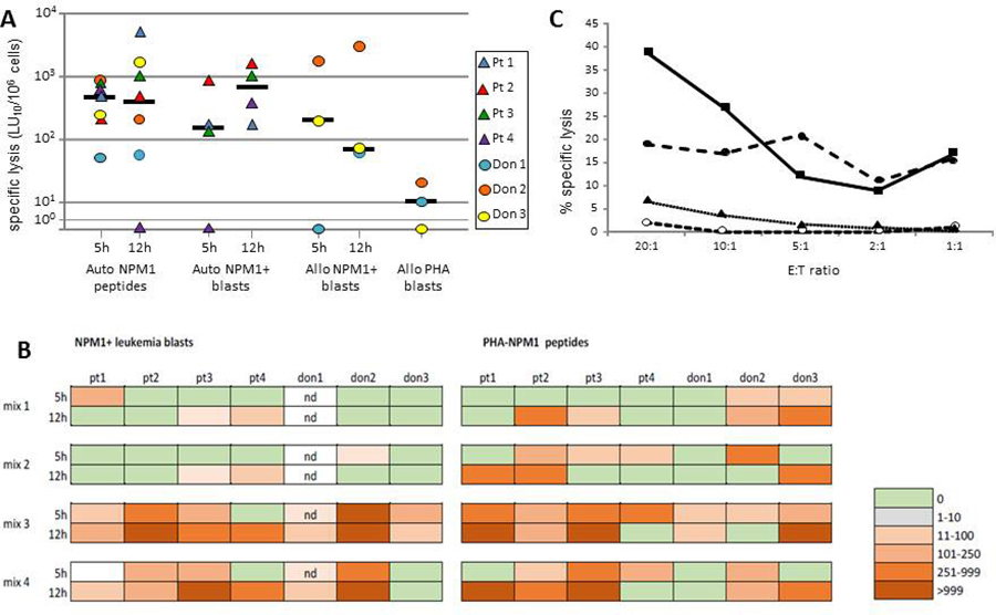 Figure 6: Cytolytic activity exerted by NPM1-specific T cell lines. Cytotoxic activity of PBMCs after 13-day culture in the presence of NPM1-mutated–derived peptides against autologous PHA blasts pulsed with NPM1-mutated peptides (Auto NPM1 peptides, 5 h- and 12 h-cytotoxicity assay), autologous NPM1-mutated blasts (Auto NPM1 blasts, 5 h- and 12 h-cytotoxicity assay), allogeneic NPM1-mutated blasts (Allo NPM1 blasts 5 h- and 12 h-cytotoxicity assay), allogeneic PHA blasts from the donor of the allogeneic NPM1-mutated blasts (Allo PHA blasts). The results are represented as the number of lytic units per 106 cells (LU10/106) and reported for each subject tested and as median value. LU values referring to lysis of autologous PHA blasts pulsed with NPM1-mutated peptides were calculated after subtraction of background, consisting of cytotoxicity against autologous PHA blasts pulsed with irrelevant peptides (Panel A). Cytotoxic responses to NPM1-mutated+ autologous (patients) or allogeneic (donors) leukemic blasts or to NPM1-mutated peptide-pulsed PHA blasts in the cultures obtained by stimulation with different NPM1-mutated peptide mixtures (mix 1: peptides 2.9 and 4.9; mix 2: peptides 13.9 and 14.9; mix 3; peptides 13.9, 14.9, and 15.11; mix 4: all 18 peptides) in the subjects tested (Panel B). Boxes indicate 5 h- and 12 h-cytotoxicity as LU10/106, according to color intensity from green (0 LU10/106) to bright orange (>999 LU10/106), as reported in the figure. Nd: not done. Cytotoxicity profile of cultured PBMCs obtained from donor 2 (Panel C). The figure reports the percentage of specific lysis against autologous PHA blasts pulsed with NPM1-mutated peptides (dashed line, solid circles) or with control peptides (dashed line, open circles), allogeneic NPM1-mutated blasts (solid line, squares), and allogeneic PHA blasts from the same donor of the NPM1-mutated+ blasts (dotted line, triangles). The mean percent lysis of duplicate wells for 5 different effector-to-target (E:T) ratios is shown.