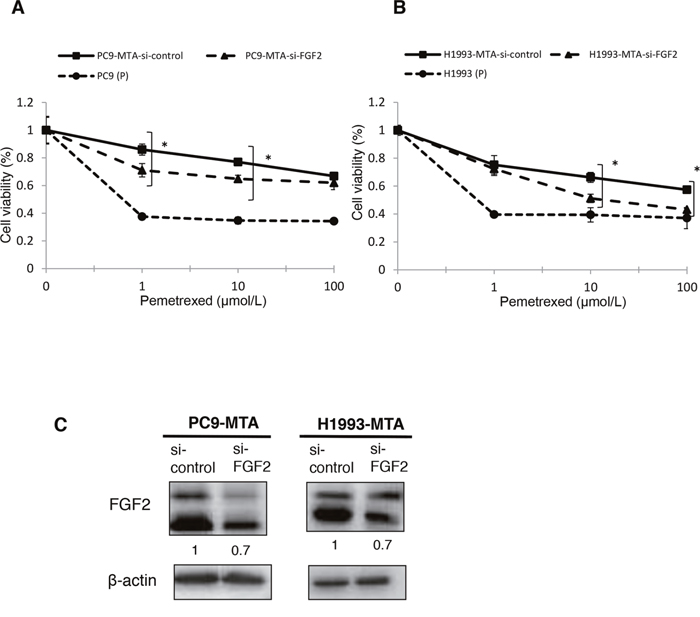 Figure 2: Effects of FGF2 knockdown in pemetrexed-resistant lung cancer cells. The expression of FGF2 in PC9-MTA and H1993-MTA cells was inhibited by siRNA, and the sensitivity to pemetrexed was tested using WST assays. (A) Sensitivity to pemetrexed was measured in PC9-MTA cells transfected with siRNA targeting control (si-control) or FGF2 (si-FGF2) and the parental PC9 cells (P). (B) Sensitivity to pemetrexed was measured in H1993-MTA cells transfected with siRNA (si-control or si-FGF2) and the parental H1993 cells (P). The error bars in each graph represent the standard error of the value obtained in the experiments performed in triplicate. (C) FGF2 expression as determined by the Western blot analyses in PC9-MTA cells and H1993-MTA cells transfected with si-FGF2 or si-control.
