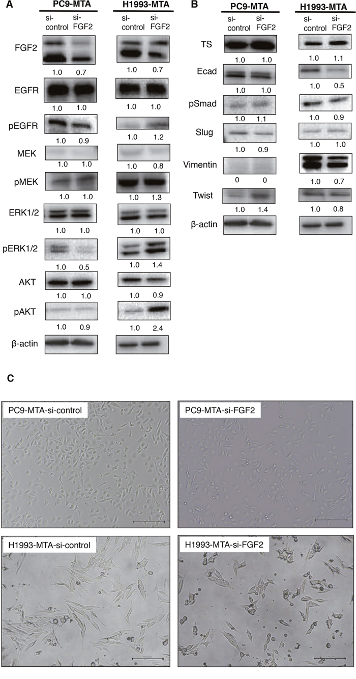 Figure 4: Effects of FGF2 knockdown on signaling pathway molecules and EMT marker proteins in the parental and pemetrexed-resistant lung cancer cells. (A) Western blot analyses of expression of total or phosphorylated forms (pEGFR, pMEK, pERK, and pAKT) of signaling molecules in the PC9-MTA and H1993-MTA cells transfected with control siRNA (si-control) or siRNA targeting FGF2 (si-FGF2). β-actin was used as a loading control. The experiments were repeated independently at least three times, and one representative blot is provided in the figures. The quantitative numbers of relative expression levels corrected by β-actin were demonstrated below the picture of the blots. (B) Western blot analyses of expression of TS and EMT marker proteins in the PC9-MTA and H1993-MTA cells transfected with si-control or si-FGF2. (C) Morphological findings of PC9-MTA and H1993-MTA cells transfected with si-control or si-FGF2. Scale bars = 500 μm.