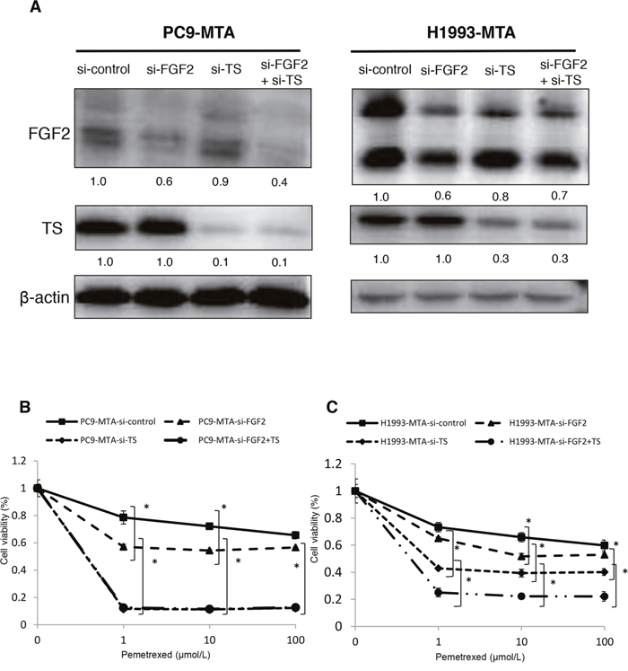 Figure 6: Effects of individual or dual knockdown of FGF2 and TS on sensitivity to pemetrexed in the pemetrexed-resistant lung cancer cells. (A) FGF2 and TS expression as determined by Western blot analyses in the PC9-MTA cells and H1993-MTA cells transfected with control siRNA (si-control), siRNA targeting FGF2 (si-FGF2), siRNA targeting TS (si-TS), or both (si-FGF2 + TS). β-actin was used as a loading control. (B, C) Sensitivity to pemetrexed was measured in PC9-MTA (B) or H1993-MTA (C) cells transfected with si-control, si-FGF2, si-TS, or si-FGF2 + TS. The error bars in each graph represent the standard error of the value obtained in the experiments performed in triplicate.
