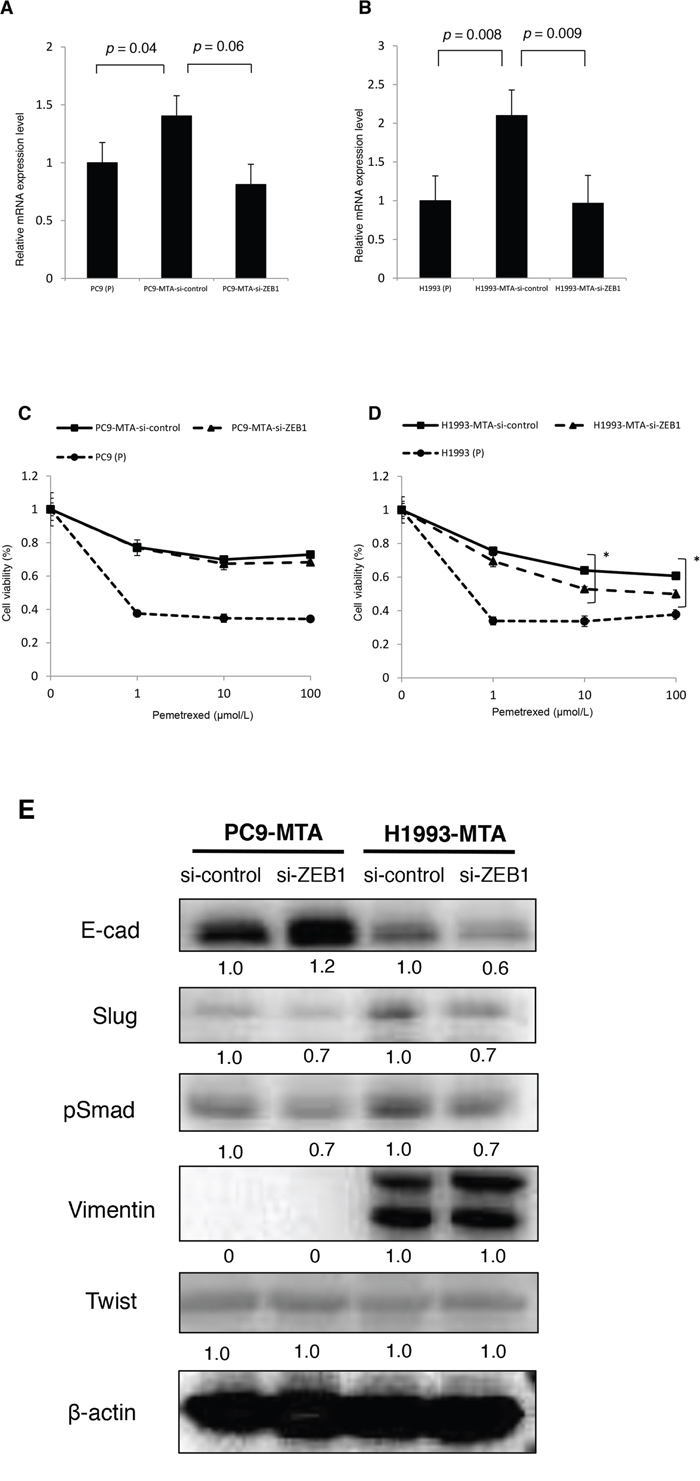 Figure 7: Effects of ZEB1 knockdown on the sensitivity to pemetrexed in the pemetrexed-resistant lung cancer cells. (A, B) ZEB1 expression was quantitated by real-time RT-PCR in the parental PC9 cells (P) and PC9-MTA cells (A) and the parental H1993 (P) cells and H1993-MTA cells (B) transfected with control si-RNA (si-control) and siRNA targeting ZEB1 (si-ZEB1). (C, D) Sensitivity to pemetrexed was measured in parental (P) and PC9-MTA cells (C) and in parental H1993 (P) and H1993-MTA cells (D) transfected with each si-RNA (si-control and si-ZEB1) using the WST assay. The error bars in each graph represent the standard error of the value obtained in the experiments performed in triplicate. (E) Western blot analysis of the expression of EMT marker proteins in PC9-MTA and H1993-MTA cells transfected with si-control or si-ZEB1. β-actin was used as a loading control.