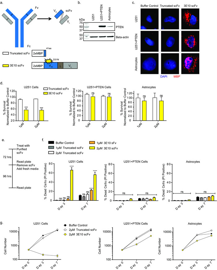 Figure 1: 3E10 scFv confers synthetic lethality with PTEN deficiency in a glioma cell line. a. Schematic of the 3E10 full length antibody as well as the derived scFv. The scFv consists of the heavy chain (VH) and light chain (VL) connected by a flexible linker (L). The scFv was cloned into a 2XMBP_phCMV1 expression vector. Expression constructs for each scFv are schematized. b. Western blot analysis of PTEN expression in U251 glioma cells, the PTEN complemented U251+PTEN cells and human astrocyte cells. c. Immunofluorescence analysis of cellular uptake of the purified scFv proteins in the U251, U251+PTEN and human astrocyte cells. d. Clonogenic survival results of U251, U251+PTEN or astrocyte cell lines treated with purified 3E10-scFv proteins. Error bars represent the SEM; ***P < 0.001 by unpaired t-test. e. U251, U251+PTEN or astrocyte cell lines were treated with either truncated scFv or 3E10 scFv at 1 μM or 2 μM for three days and then grown in fresh media for an additional four days. On day 3 and day 7, cells were stained with Hoescht dye and propidium iodide in order to quantify cell death over time. f. Cell death for each cell line under each treatment condition was plotted for each time point. Error bars represent the SEM; ****P < 0.0001 by unpaired t-test. g. Representative cell number for each cell line under each treatment condition was plotted for each time point.