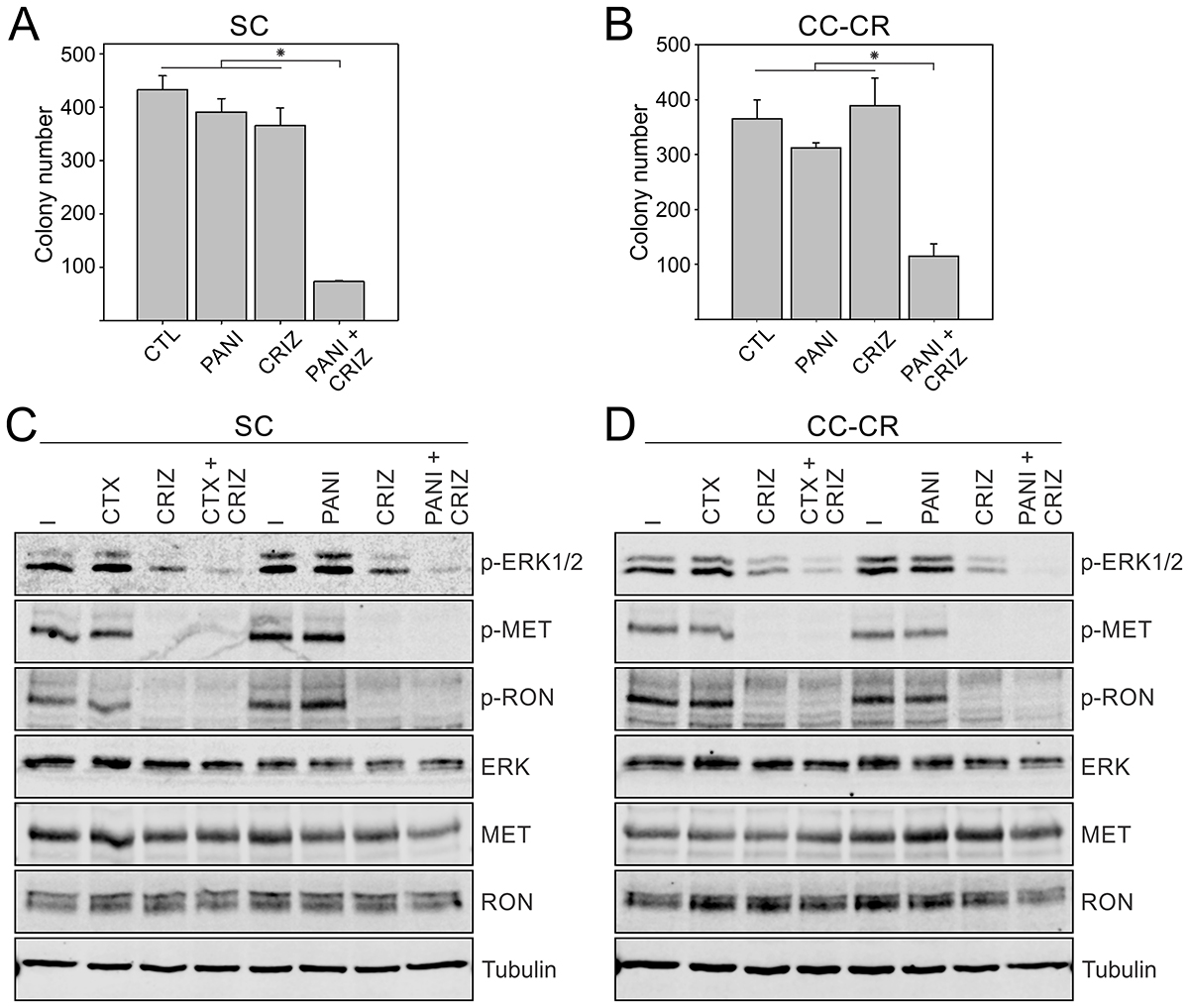 Figure 2: Overcoming panitumumab resistance in SC and CC-CR cells by crizotinib. Two thousand SC (A) and CC-CR (B) cells were cultured in type I collagen for two weeks. Fresh medium was added with panitumumab (PANI, 3 μg/ml) and crizotinib (CRIZ, 0.05 μM) every two to three days as indicated. Colony counts are plotted as mean ± SEM. *indicate statistically significant differences (p < 0.05). (C, D) One hundred thousand SC (C) and CC-CR (D) cells were cultured in type I collagen for seven days and incubated with cetuximab (CTX, 3 μg/ml), panitumumab (PAN, 3 μg/ml), and/or crizotinib (CRIZ, 0.05 μM) for 6 h. Middle collagen layers containing cells were lysed, resolved on SDS-PAGE, and immunoblotted for the indicated proteins.