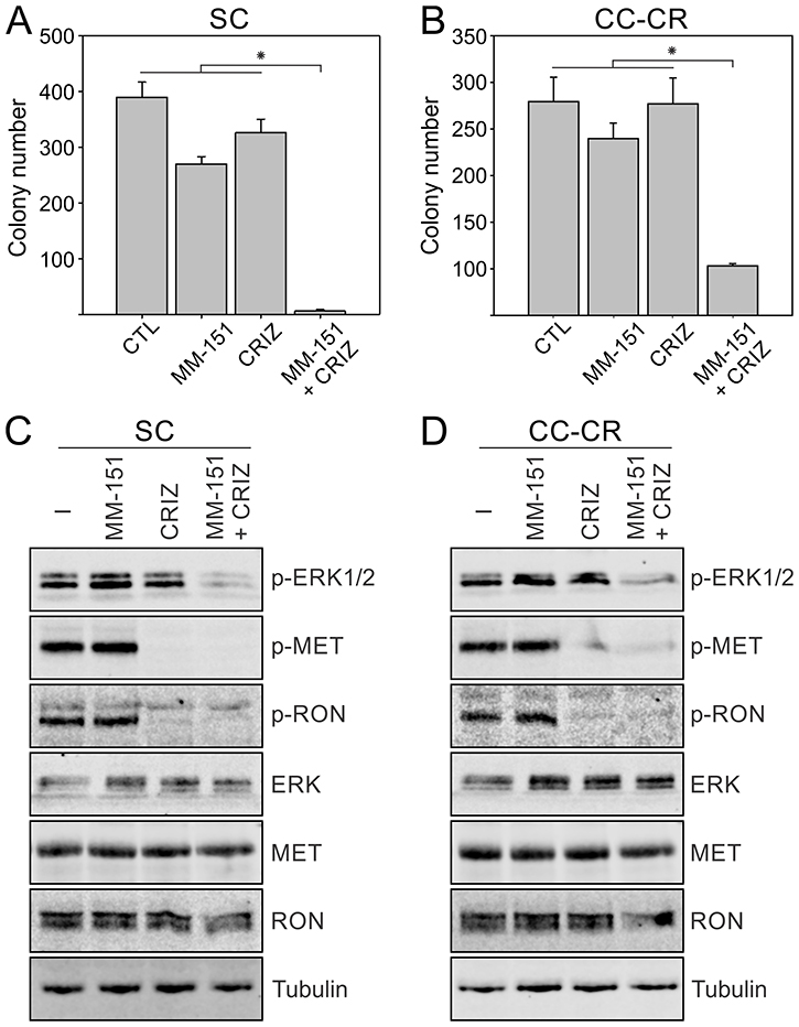 Figure 3: Overcoming MM-151 resistance in SC and CC-CR cells by crizotinib. Two thousand SC (A) and CC-CR (B) cells were cultured in type I collagen for two weeks. Fresh medium was added with MM-151 (3 μg/ml) and crizotinib (CRIZ, 0.05 μM) every two to three days as indicated. Colony counts are plotted as mean ± SEM. *indicate statistically significant differences (p < 0.05). (C, D) One hundred thousand SC (C) and CC-CR (D) cells were cultured in type I collagen for seven days and incubated with cetuximab (CTX, 3 μg/ml), MM-151 (3 μg/ml), and/or crizotinib (CRIZ, 0.05 μM) for 6 h. Middle collagen layers containing cells were lysed, resolved on SDS-PAGE, and immunoblotted for the indicated proteins.