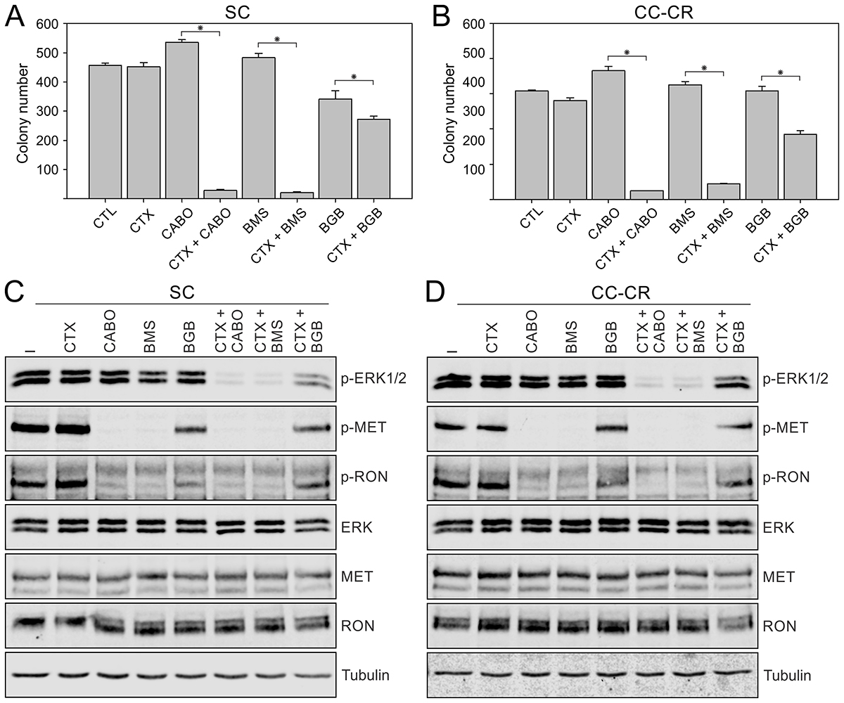 Figure 4: Overcoming cetuximab resistance in SC and CC-CR cells by multi-RTK inhibitors. Two thousand SC (A) and CC-CR (B) cells were cultured in type I collagen for two weeks. Fresh medium was added with cetuximab (CTX, 3 μg/ml), cabozantinib (CABO, 1.5 μM), BMS-777607 (BMS, 1.5 μM), and/or bemcentinib/BGB324 (BGB, 1.8 μM) every two to three days as indicated. Colony counts are plotted as mean ± SEM. *indicate statistically significant differences (p < 0.05). (C, D) One hundred thousand SC (C) and CC-CR (D) cells were cultured in type I collagen for seven days and incubated with cetuximab (CTX, 3 μg/ml), cabozantinib (CABO, 1.5 μM), BMS-777607 (BMS, 1.5 μM), and/or bemcentinib/BGB324 (BGB, 1.8 μM) for 6 h. Middle collagen layers containing cells were lysed, resolved on SDS-PAGE, and immunoblotted for the indicated proteins.