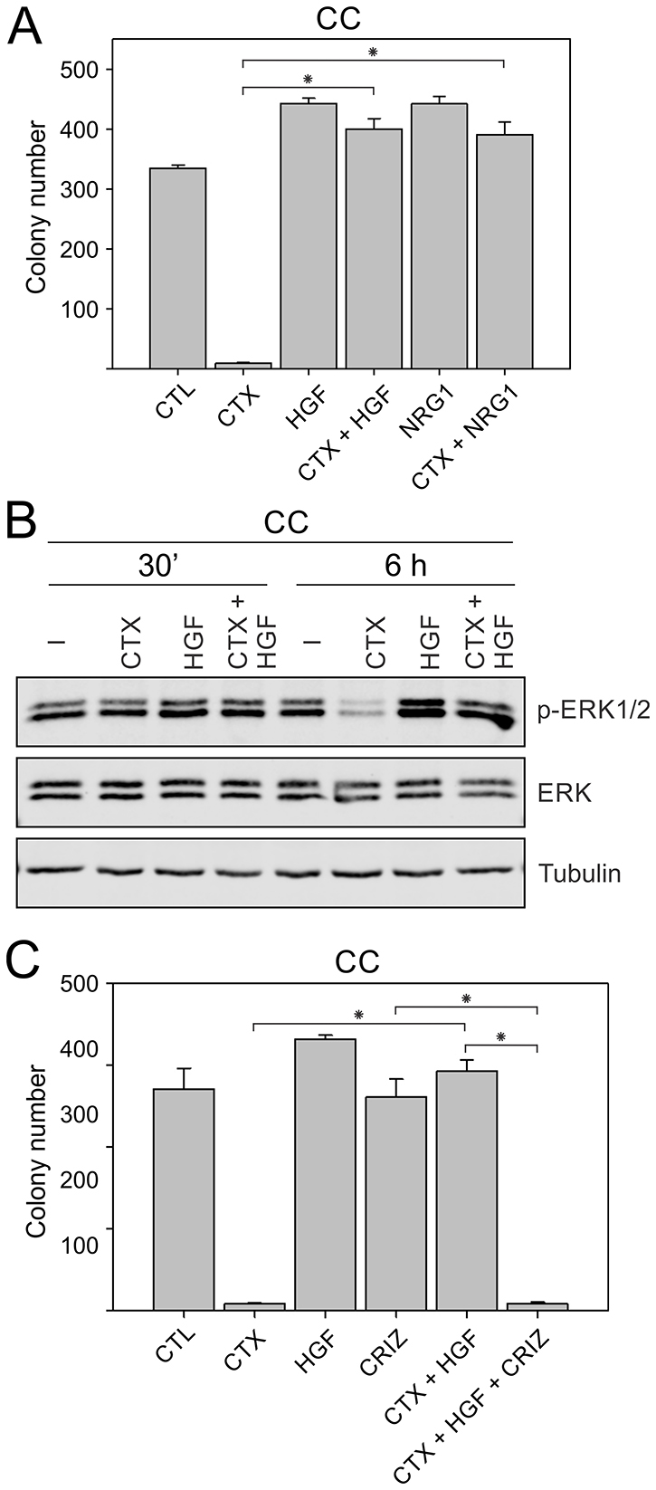 Figure 5: Inducing cetuximab resistance in CC cells by addition of RTK ligands, HGF and NRG1. (A) Two thousand CC cells were cultured in type I collagen for two weeks. Fresh medium was added with cetuximab (CTX, 3 μg/ml), HGF (50 ng/ml), or NRG1 (50 ng/ml) every two to three days as indicated. Colony counts are plotted as mean ± SEM. *indicate statistically significant differences (p < 0.05). (B) One hundred thousand CC cells were cultured in type I collagen for seven days and incubated with cetuximab (CTX, 3 μg/ml), HGF (50 ng/ml), or NRG1 (50 ng/ml) for 6 h. Middle collagen layers containing cells were lysed, resolved on SDS-PAGE, and immunoblotted for the indicated proteins. (C) Two thousand CC cells were cultured in type I collagen for two weeks. Fresh medium was added with cetuximab (CTX, 3 μg/ml), HGF (50 ng/ml), and/or crizotinib (CRIZ, 0.05 μM) every two to three days as indicated. Colony counts are plotted as mean ± SEM. *indicate statistically significant differences (p < 0.05).