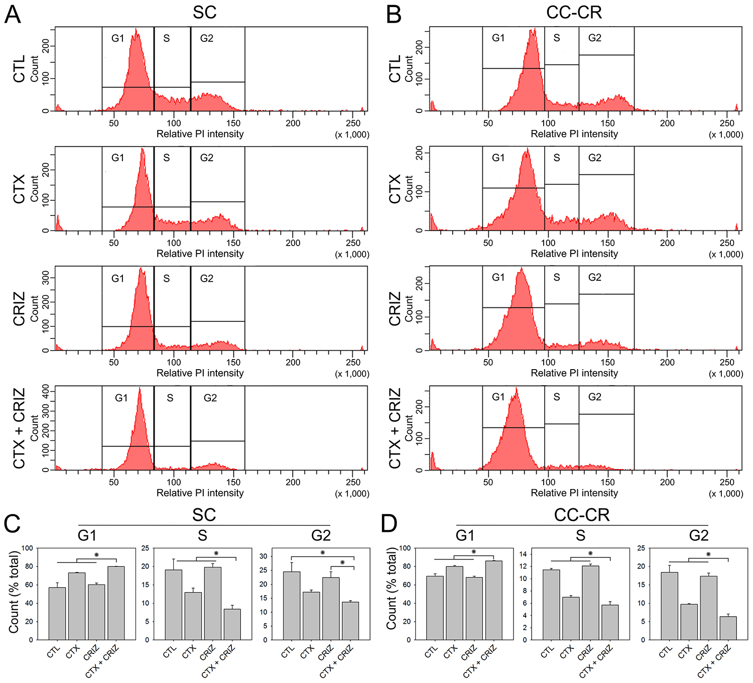 To identify the mechanism of SC and CC-CR colony growth inhibition due to multi-RTK inhibition, we elected to perform cell cycle analysis of SC and CC-CR cultures under different treatments. We treated one-week old SC and CC-CR cultures with drug combinations for ~20 hours and then subjected them to cell cycle analysis by flow cytometry. For both SC and CC-CR cultures, we identified that cetuximab alone induces a small but significant G0/G1 cell cycle block (Figure 6A, 6B). Crizotinib alone was unable to induce G0/G1 cell cycle block. In the cetuximab/crizotinib combination, however, more cells accumulated in the G0/G1 phase of cell cycle, compared to control cells or individual treatments, along with a concomitant reduction in S and G2/M population (Figure 6A–6D).