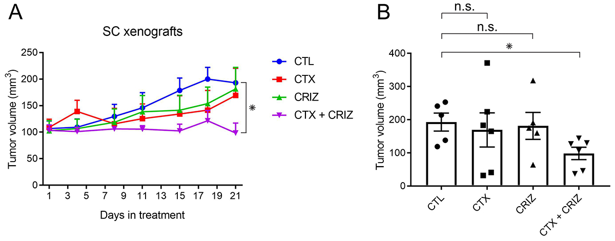 Figure 7: Overcoming cetuximab resistance by RTK inhibition with crizotinib in vivo. (A) Five million SC cells were injected subcutaneously in female athymic nude mice. After the tumors reached an average size of 100 mm3, they were separated into four groups and treated with cetuximab (CTX, 0.5 mg/kg) and/or crizotinib (CRIZ, 5 mg/kg) as indicated for 21 days (n = 5 for CTL, n = 6 for CTX, CRIZ, and CTX/CRIZ). All tumors were measured twice a week, and average volumes for each group are plotted with SEM as corresponding error bars. *indicates statistically significant differences (p < 0.05). (B) Graphical representation of the end point (day 21) volume measurements for each group as mean ± SEM. *indicate statistically significant differences (p < 0.05). n.s. indicates no statistically significant difference between compared conditions (p ≥ 0.05).
