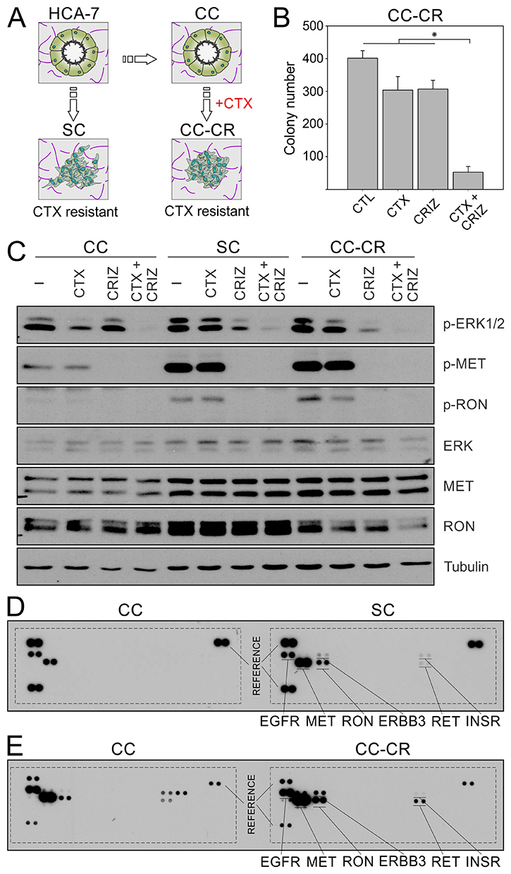 Figure 1: Overcoming de novo and acquired mode of cetuximab resistance in CRC by crizotinib. (A) Parental HCA-7 cells and its subclone, CC, predominately form uniform cysts in 3D collagen cultures, while SC derivatives form disorganized colonies. CC-CR, derived from CC cultured in 3D in the presence of cetuximab, also form disorganized colonies with incompletely cleared lumens. Both SC and CC-CR are cetuximab-resistant and exhibit high levels of MET and RON phosphorylation. (B) Two thousand CC-CR cells were cultured in type I collagen for two weeks in the presence of cetuximab (CTX, 3 μg/ml) and/or crizotinib (CRIZ, 0.05 μM). Colony counts are plotted as mean ± SEM. *indicate statistically significant differences (p < 0.05). (C) One hundred thousand CC, SC, and CC-CR cells were cultured in type I collagen for seven days and incubated with cetuximab (CTX, 3 μg/ml) and/or crizotinib (CRIZ, 0.05 μM) for 6 h. Middle collagen layers containing cells were lysed, resolved on SDS-PAGE, and immunoblotted for the indicated proteins. Please note that reduction in ERK1/2 phosphorylation by cetuximab is only achieved in CC cells (compare lanes 2, 6, and 10 with lanes 1, 5, and 9, respectively). (D) CC and SC 3D cultures were lysed, and equal amounts of cell lysates were analyzed using the human phospho-RTK array kit; CC RTK phosphorylation status is on the left, while SC RTK phosphorylation status is on the right, with key RTKs highlighted. Three reference pairs are on each phospho-RTK blot of CC and SC. (E) Comparison of CC (left) and CC-CR (right) tyrosine phosphorylation status of individual RTKs; samples were processed as in D.