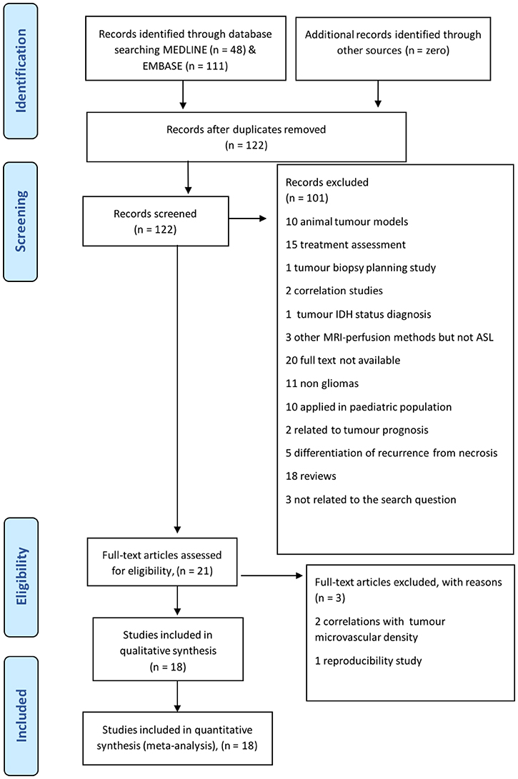 This meta-analysis followed the Preferred Reporting Items for Systematic reviews and Meta-Analyses (PRISMA) guidelines with the research question being ‘What is the diagnostic value of arterial spin labelling (ASL) in the differentiation of glioma grades in adult patients?’ [12]. The search terms were identified according to the Population/Intervention/Comparator/Outcomes (PICO category) recommendations and were linked by Boolean operators (‘OR’ within each PICO category; and ‘AND’ between PICO categories). The identified search terms were framed in concepts. Concept 1 (P): glioma OR neuroglia OR glioma; Concept 2 (I): arterial spin OR artery spin; Concept 3 (O): diagnosis OR grading OR differentiate. Finally, the search was conducted without the third concept in order to cast a wider net. As a result, steps 1 and 2 were combined [(glioma OR neuroglia OR glioma) AND (arterial spin OR artery spin)]. The systematic search was performed in June 2018 through EMBASE ‘(1974 to 8 June 2018)’ and Ovid MEDLINE (R) ‘In-process and other non-indexed citations’ databases to find relevant articles that met the defined search terms; this resulted in the identification of 111 and 48 items respectively. A total of 159 items were found, which were rendered to 122 after duplicates were removed. We included records focusing on pre-treatment glioma grading in adults using ASL. Relevant articles were selected according to PRISMA (see relevant flow chart in Figure 1). 104 of them were excluded as they did not met the research question; for example: they applied ASL in animal models [13] use ASL in order to asses the treatment [14, 15] or applied in pediatric population [16]. Eventually, 18 studies were deemed eligible in terms of the selected inclusion criteria.