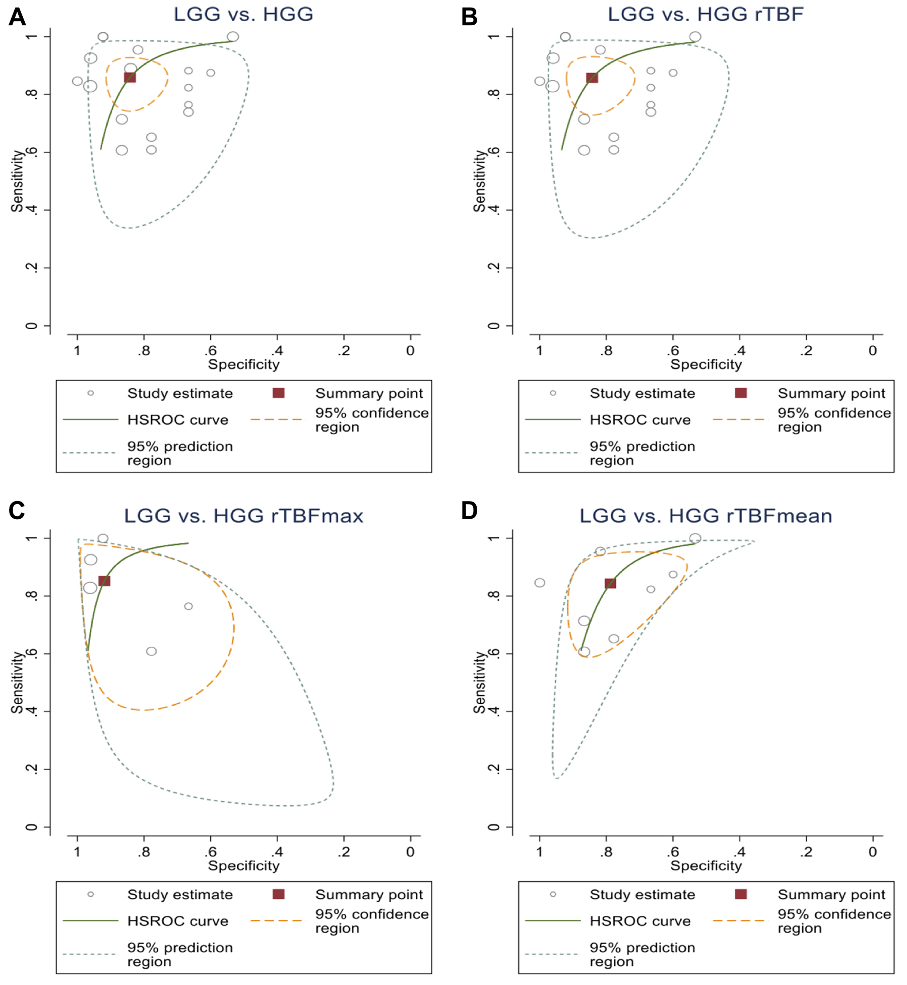 Figure 4: HROC plot shows the summary point of the sensitivity and the specificity (square) and its 95% CI (the green curve). (A) from all of the analysed ASL parameters to differentiate between HGGs and LGGs (86%, CI (78%, 91%)) and (84%, CI (76%, 90%)), respectively; (B) rTBF to differentiate between HGGs and LGGs (86%, CI (77%, 91%)) and (84%, CI (76%, 90%)), respectively; (C) rTBFmean to differentiate between HGGs and LGGs (84%, CI (71%, 92%)) and (79%, CI (66%, 88%), respectively; (D) rTBFmax to differentiate between HGGs and LGGs (85%, CI (69%, 94%)) and (92%, CI (80%, 97%)).