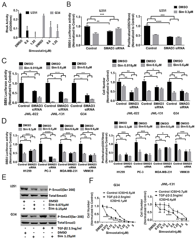 Figure 2: Statin acts on TGF-β through RhoA and Smad3. (A) Simvastatin dose-dependently decreased RhoA activity in U251MG and G34. (B), (C), (D), SMAD3 knockdown reduced SBE4 luciferase activity and cell proliferation and ameliorated simvastatin’s effects on TGF-β reporter activity and cell proliferation in U251MG (B), in GICs JWL-022, JWL-131 and G34 (C), and in multiple other cancer types (D). (E) Simvastatin reduced Smad3 phosphorylation at ser208 in U251MG (top panel) and basal and exogenous TGF-β-induced Smad3 phosphorylation at ser208 in G34 (bottom panel). (F) Cell counts of adherent G34 and JWL-131 GICs after six days of simvastatin +/-exogenous TGF-β. Sim: simvastatin. All values are the mean±SD of three experiments. *, P<0.05; **, P<0.01. ***, P<0.001. ****, P<0.0001.