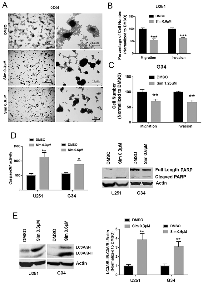 Figure 3: Simvastatin reduces migration and invasion and induces apoptosis and autophagy in GBM and GICs. (A) Simvastatin ablated cell spreading from adherent spheroids of G34 with a single simvastatin dose applied for 6 days. (B), (C) Simvastatin reduced migration and invasion of U251MG (B) and G34 cells (C). (D) Simvastatin induced apoptosis as indicated by increasing caspase3/7 activity (left panel) and cleaved PARP expression (right panel) in U251MG and G34. (E) Simvastatin stimulated autophagy as indicated by increased LC3A/B-II expression in U251MG and G34. Sim: simvastatin. All values are the mean±SD of three experiments. *, P<0.05; **, P<0.01. ***, P<0.001. ****, P<0.0001.