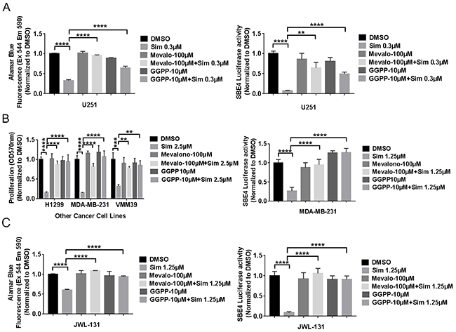 Figure 4: Selected exogenous products of HMG CoA-reductase rescued simvastatin-induced cell toxicity and TGF-β reporter activity in five cell lines of diverse cancer types. (A), (B), (C) mevalonolactone or geranylgeranyl-pyrophosphate (GGPP) rescue of decreased viability and TGF-β activity from simvastatin in U251MG (A), other cancer cells (B), JWL-131 (C). Sim: Simvastatin. Mevalo: mevalonolactone. All values are the mean±SD of three experiments. **, P<0.01. ***, P<0.001. ****, P<0.0001.